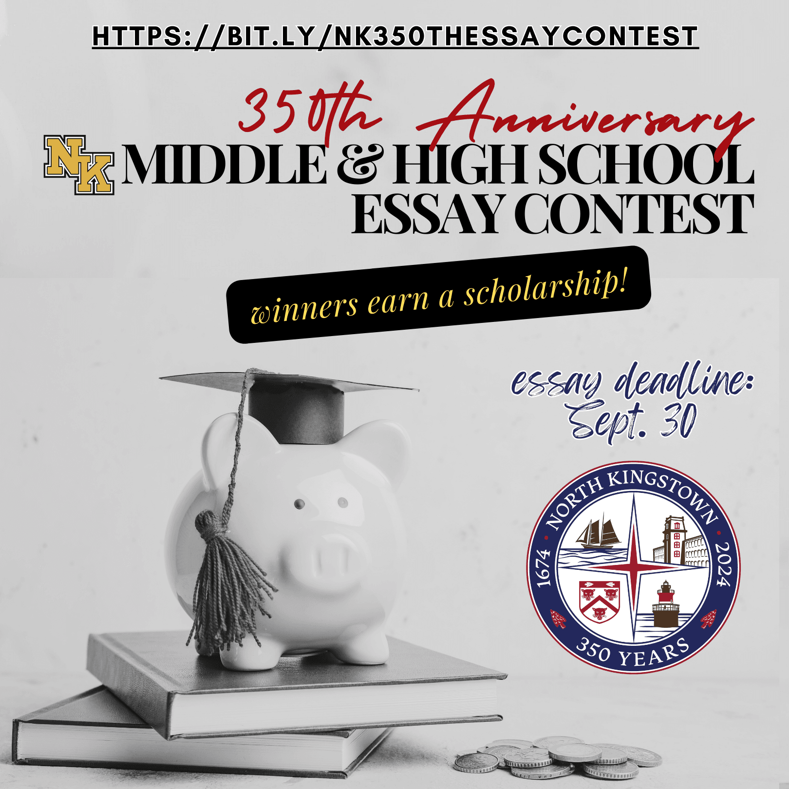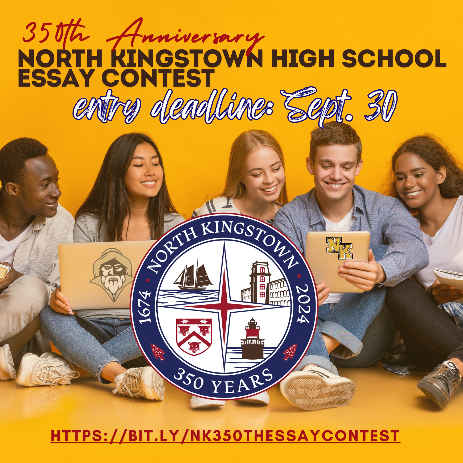 The North Kingstown 350th Anniversary High School Essay contest is open to students in grades 9-12 by the September 30, 2024, deadline who are North Kingstown residents enrolled in a public, private or parochial high school or home study program.