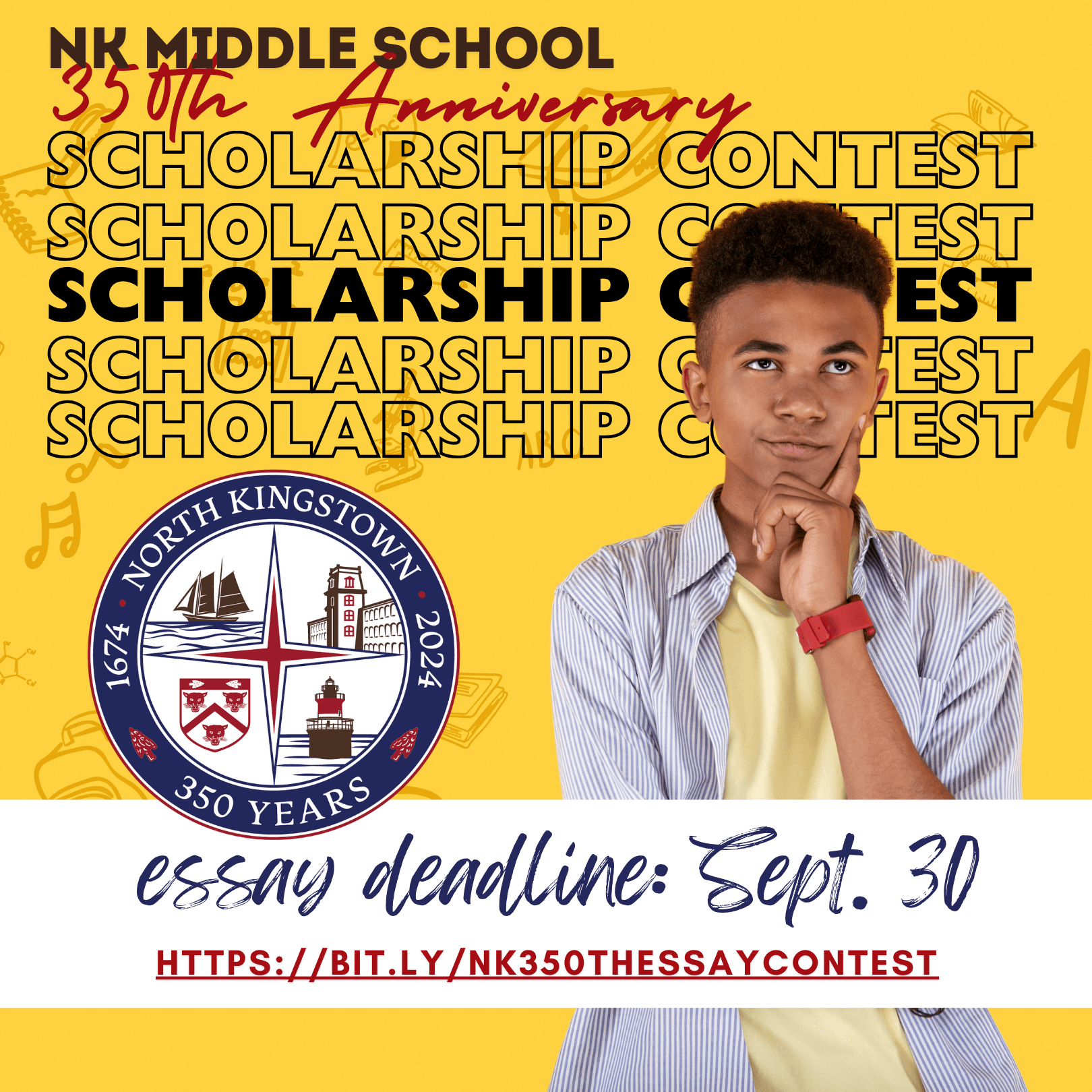 The North Kingstown 350th Anniversary Middle School Essay contest is open to students in grades 6-8 by the September 30, 2024, deadline who are North Kingstown residents enrolled in a public, private or parochial high school or home study program.