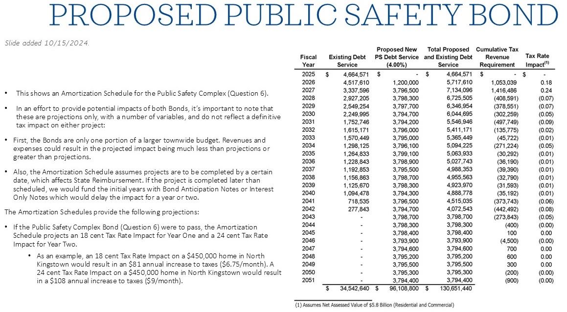 - If the Public Safety Complex Bond (Question 6) were to pass, the Amortization Schedule projects an 18 cent Tax Rate Impact for Year One and a 24 cent Tax Rate Impact for Year Two.