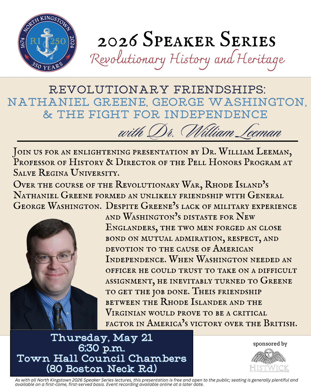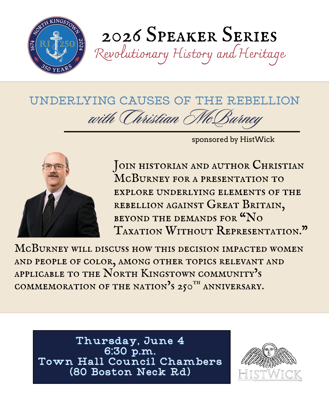 In partnership with the Town of North Kingstown Semiquincentennial Committee, the 2026 Speaker Series is a monthly event hosted by HistWick featuring notable and knowledgeable historians, artists, authors, and cultural icons delivering educational, engaging and enlightening lectures or tours on significant historical topics, documents, moments, people and/or themes related to the Revolutionary War and our municipality's history and culture as our nation marks it's 250th anniversary since the signing of the Declaration of Independence.