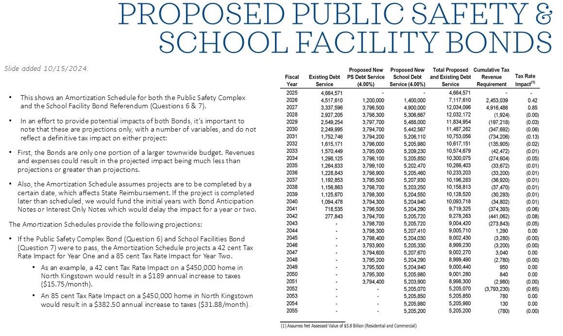 - If the Public Safety Complex Bond (Question 6) were to pass, the Amortization Schedule projects an 18 cent Tax Rate Impact for Year One and a 24 cent Tax Rate Impact for Year Two.