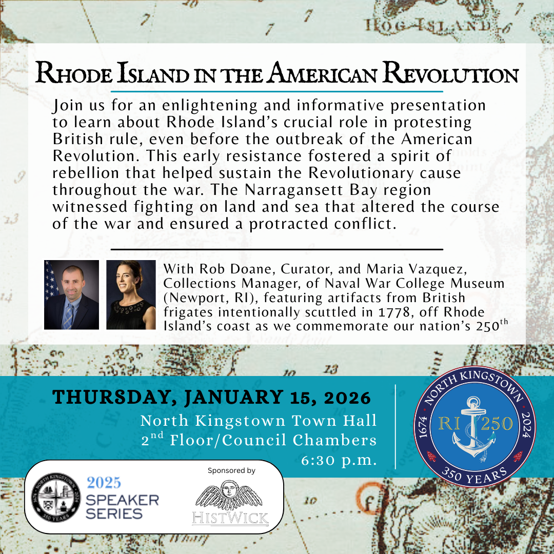 In partnership with the Town of North Kingstown Semiquincentennial Committee, the 2026 Speaker Series is a monthly event hosted by HistWick featuring notable and knowledgeable historians, artists, authors, and cultural icons delivering educational, engaging and enlightening lectures or tours on significant historical topics, documents, moments, people and/or themes related to the Revolutionary War and our municipality's history and culture as our nation marks it's 250th anniversary since the signing of the Declaration of Independence.
