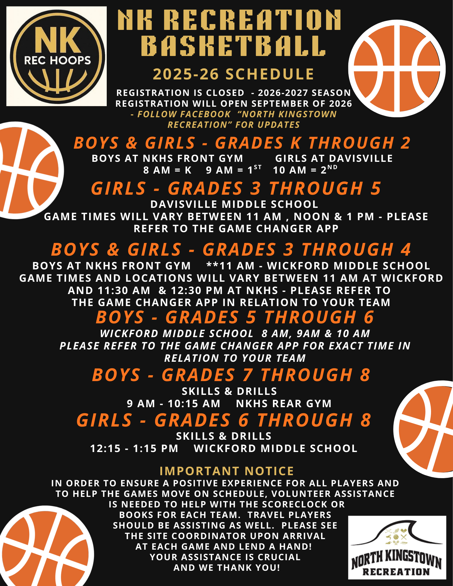Pre-registration is necessary for all programs. Online sign-up is recommended; in-person is available at the Recreation Department during normal business hours. Dates and venues are subject to change due to school event conflicts, inclement weather and more. You may opt to receive text and/or email notifications for program communication in your online account.