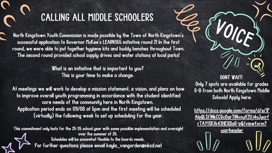 When applying this summer please note: You must be enrolled in North Kingstown Middle School. Must be in good standing with attendance at school. Communication is key. Please make sure you are entering an email that you have access to a minimum every few days. Must commit to attending MOST meetings if not all. Meetings will be scheduled by the commission and depend on the projects at hand. Projects are also proposed by the commission.