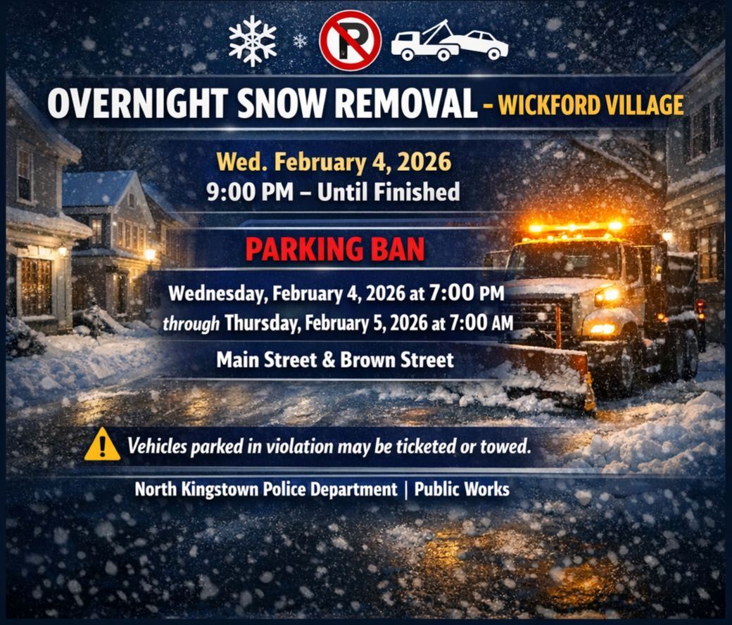 night snow removal in Wickford Village necessitates an additional Parking Ban on Main and Brown Streets, starting Wednesday, February 4 at 7:00 p.m. through Thursday, February 5 at 7:00 a.m.